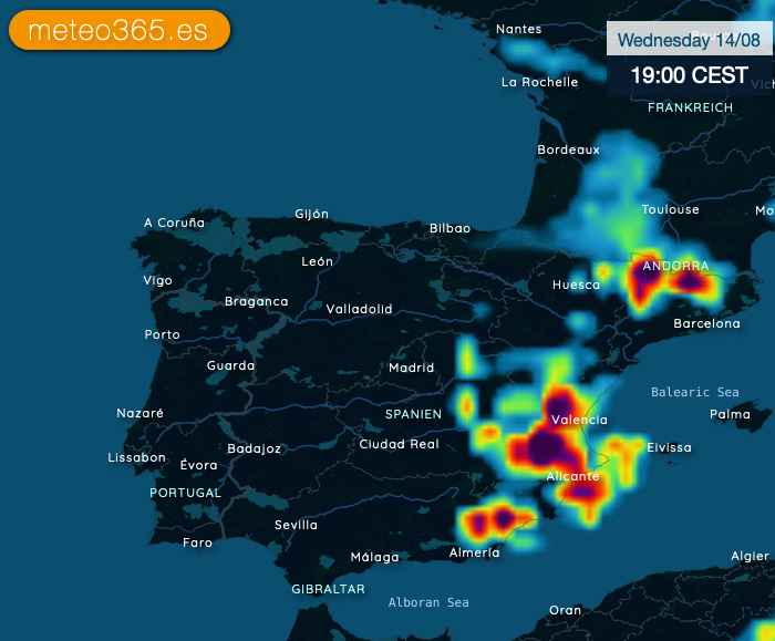 Kühle Luft vom Atlantik rückt aus Nordwest in Richtung Ostküste und Balearen vor und trifft auf heiße und feuchte Luftmassen. Da ist natürlich Ärger vorprogrammiert und es kann lokal kräftige Gewitter mit Hagel und Starkregen geben.