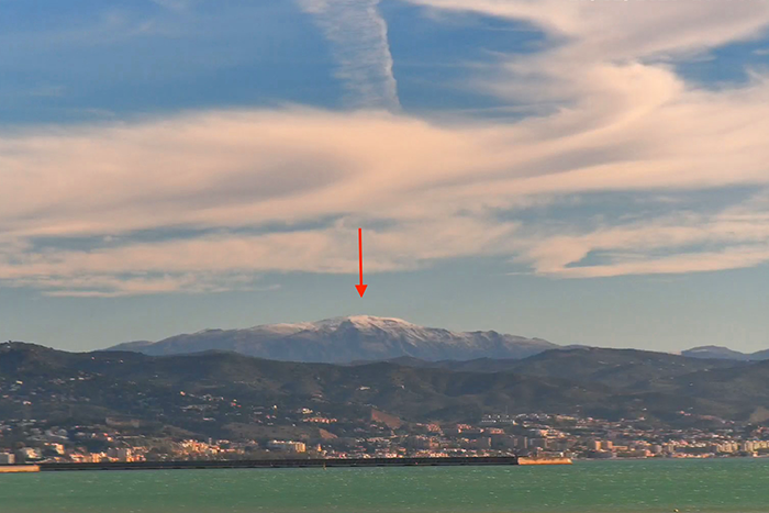 Das Foto zeigt ein Blick von Malaga auf den mit Schnee bedeckten Gipfel La Maroma