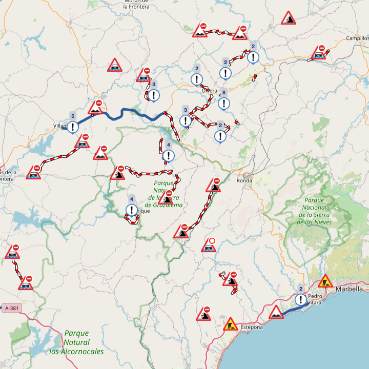 Die gute Nachricht ist, dass es aktuell auch keine Prognose für Regen in den Zonen Grazalema und der Serrania de Ronda gibt. Die Schäden auf den Straßen durch Erdrutsche sind erheblich, siehe Grafik. Die Instandsetzung wird wohl 2 bis 3 Monate dauern. Statistisch ist es so, dass wir mit den Unwettern noch nicht durch sind, denn der März bringt nicht selten noch erhebliche Regenmengen.
