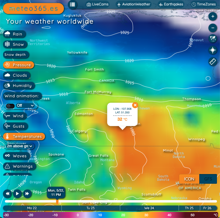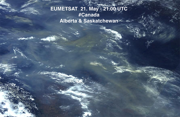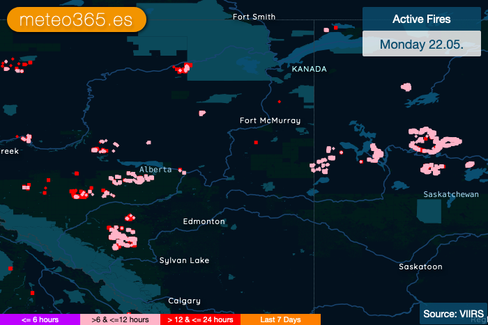 Auf dem Satellitenbild sieht man nur noch Rauch, der inzwischen auch die Gesundheit der Menschen tangiert. Betroffen sind British Columbia, Saskatchewan und Alberta. Für Alberta wurde der Notstand ausgerufen. Zehntausende Menschen mussten evakuiert werden, zahlreiche Straßen sind gesperrt. Und auch für den heutigen Montag werden in Alberta und Saskatchewan bis zu 32 °C erwartet. Allerdings kann es im Verlauf der kommenden Stunden und Tage aus Westen her vermehrt Gewitter und Regen geben. Wo und wie diese Niederschläge den Fire Fightern helfen können, dies gilt es zu beobachten.