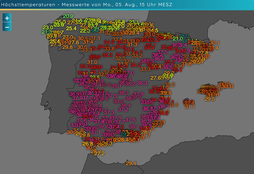 Temperatura máximas medidas el lunes 5 de agosto a las 15 horas