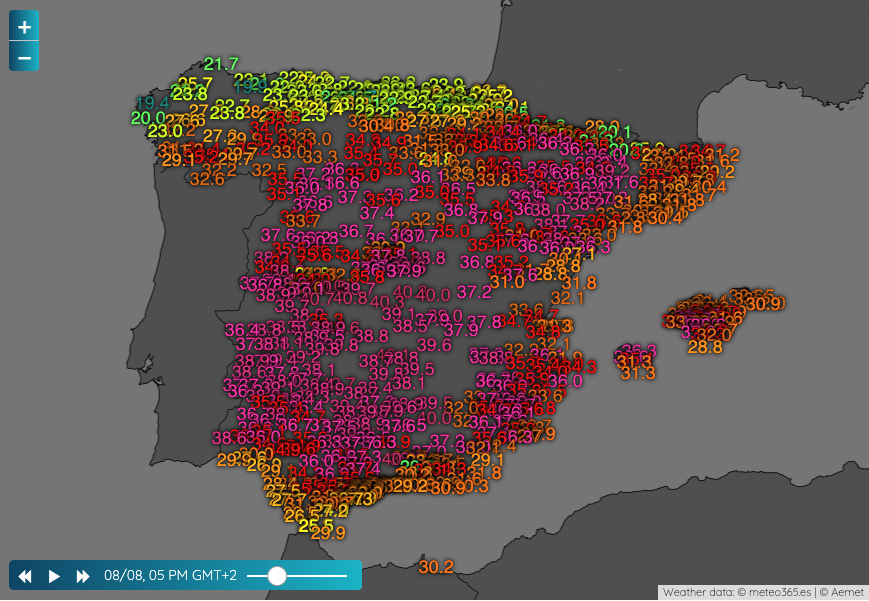 El mes de verano de agosto es temido en España: Hace calor en todo el país y apenas hay viento en las costas, pero una humedad alta, se suma la temperatura cálida del agua: esta mañana la boya de Málaga ha registrado una temperatura de 25 °C, la boca de Cabo de Gata unos 27 °C, la boya de Valencia 28,2 °C, la boya Palma de Mallorca 28,4 °C y la boya de Barcelona 28 °C.