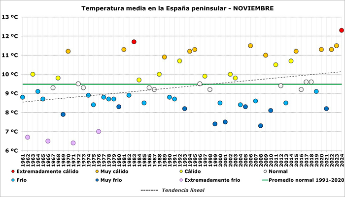 El pasado mes de noviembre de 2024 fue el noviembre más cálido desde que comenzaron los registros meteorológicos oficiales en 1961 en la Península Ibérica.