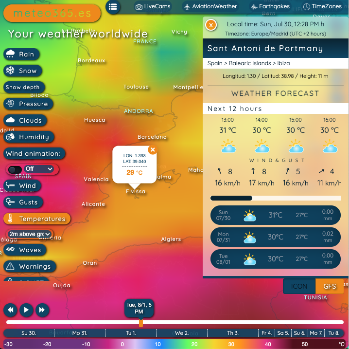 The current hourly forecast (GFS & ICON) for your location for the next 10 days is available, updated 4 times a day, here with our animated weather maps at