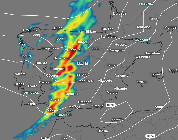 The rain band will also bring some rain to Andalusia. Currently we have 8mm of rain and 50km/h gusts forecast for Huelva and 7mm of rain and 45km/h gusts in Seville.