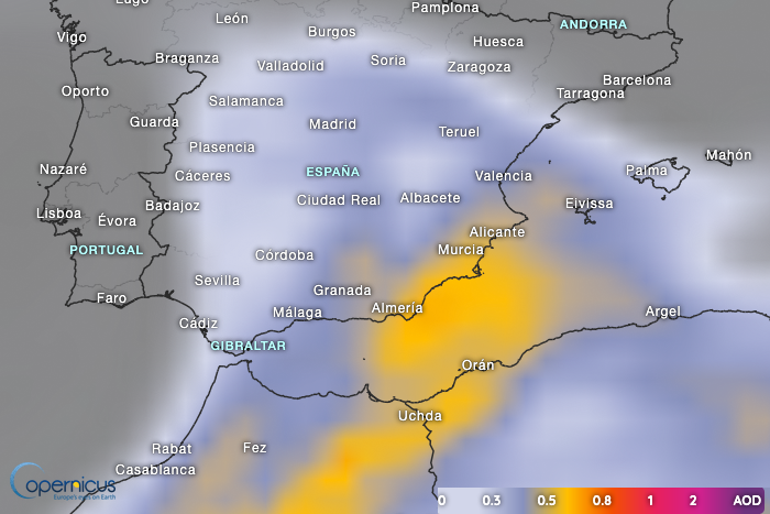 Starting Sunday afternoon, Saharan dust will move from North Africa toward Spain.