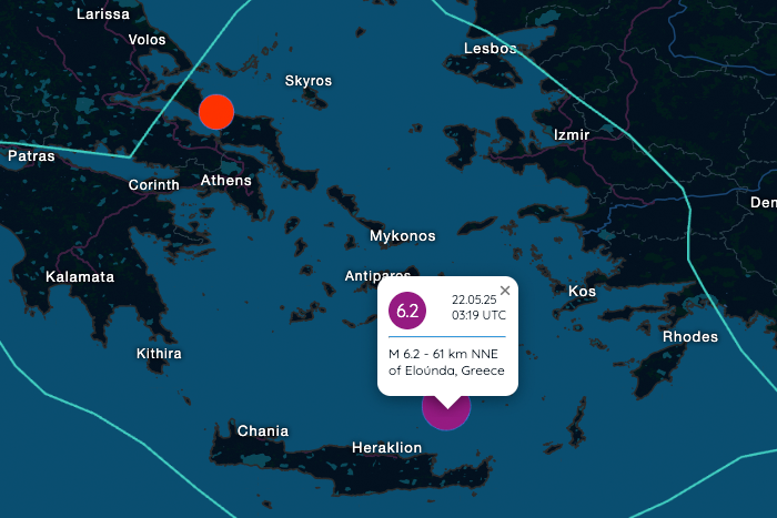 This morning, at 3:19 a.m. UTC, a severe earthquake with a magnitude of 6.2 struck in the Aegean Sea between the Greek islands of Crete and Santorini.