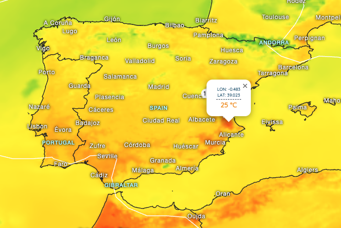 Southeastern Spain also turns very mild: Murcia reaches 23°C, Valencia 19°C, Benidorm 18°C.
